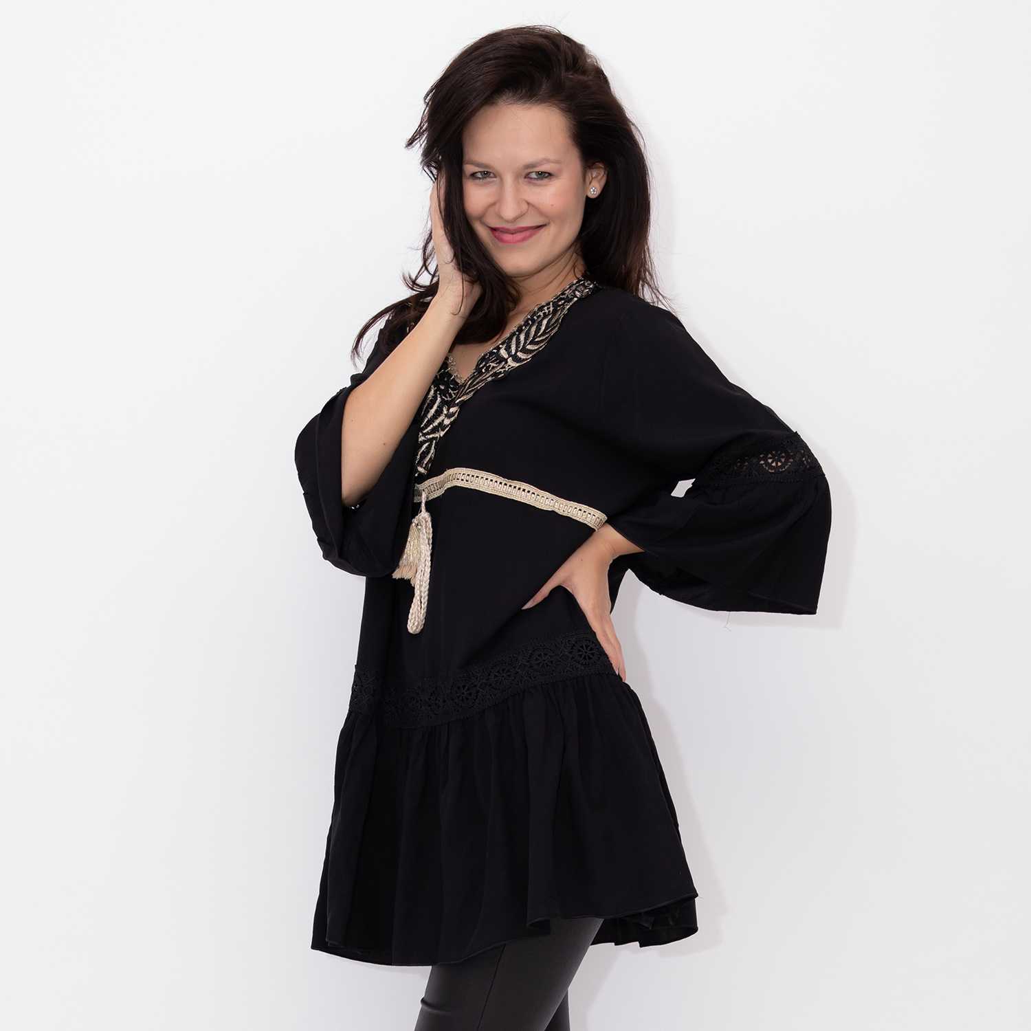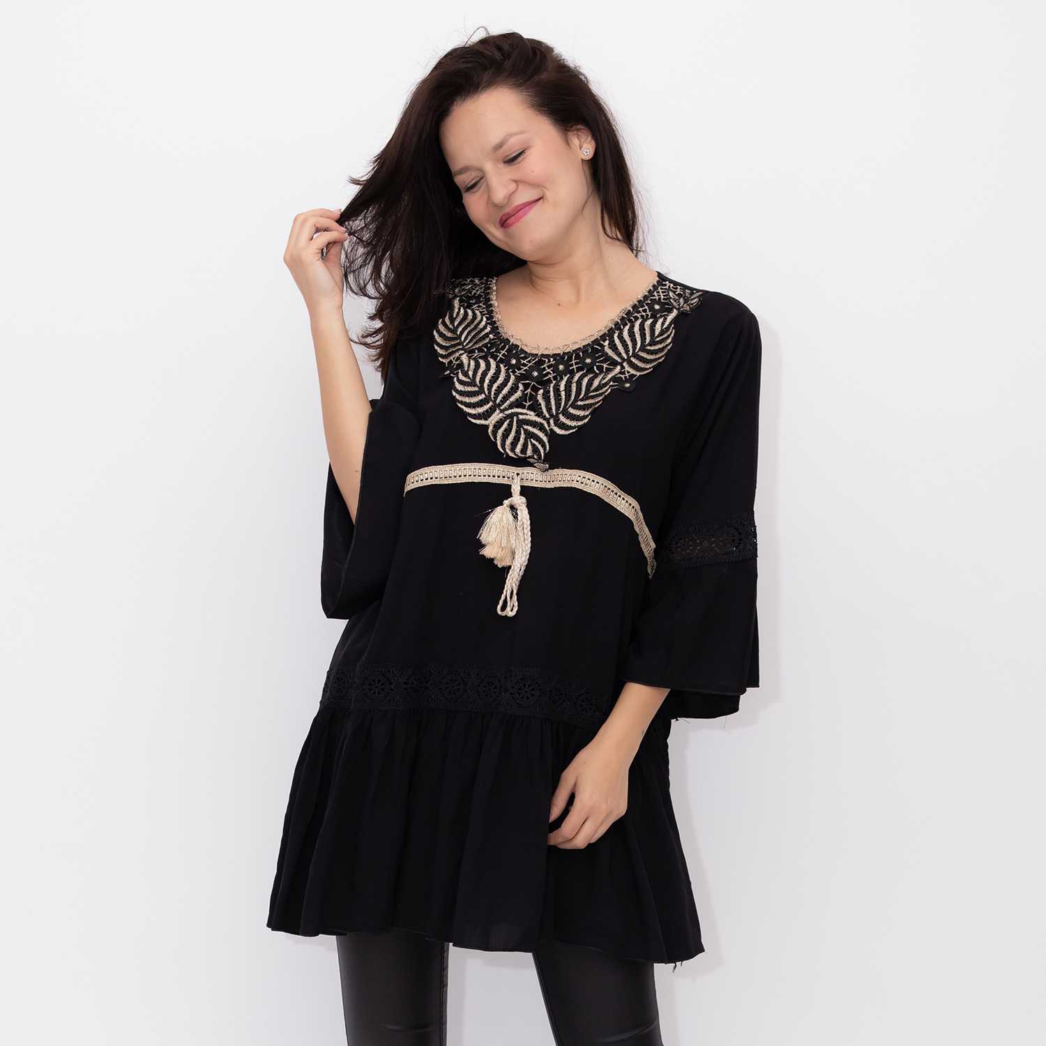 Croiul este lejer, cu maneci largi,usor evazate, cu un decolteu rotund, guler decorativ cu broderie eleganta.Lungime exstinsa, aproape de nivelul rochiei scurte-poate fi purtata ca bluza lunga sau tunica. Textrura materialului este confortabila , potrivita pentru sezonul cald.