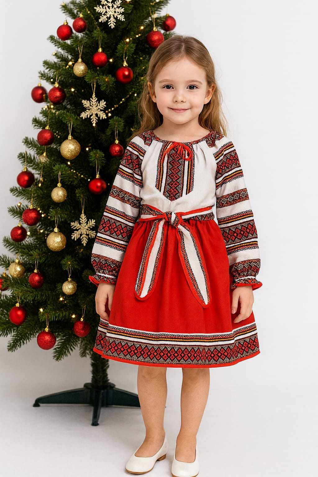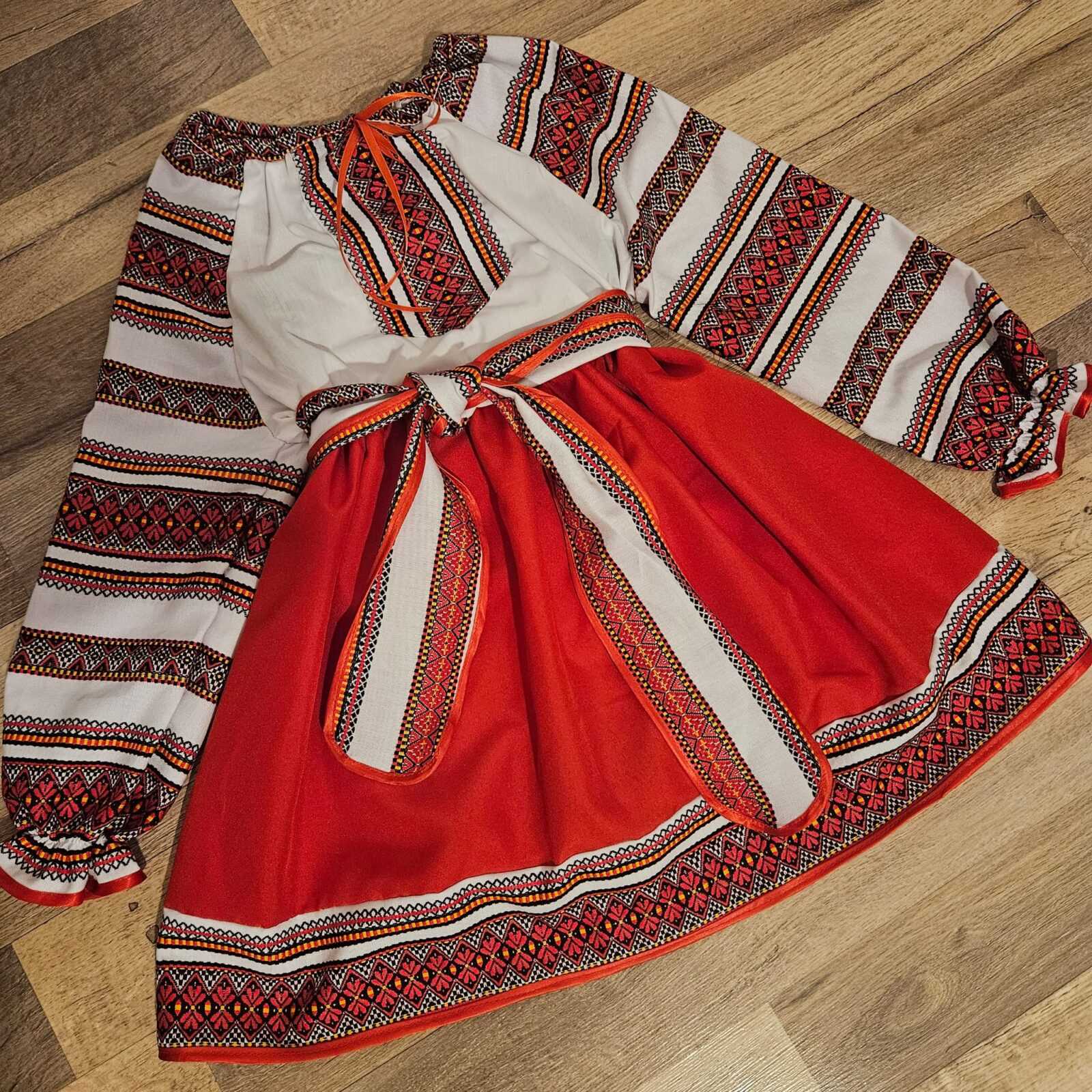 Acest costumas traditional imbina farmecul portului popuilar cu confortul modern, fiind alegerea perfecta pentru ocazii speciale. Setul este compus dintr o bluza tip ie si o fustita rosie cu brau decorativ, cu motive geometrice.