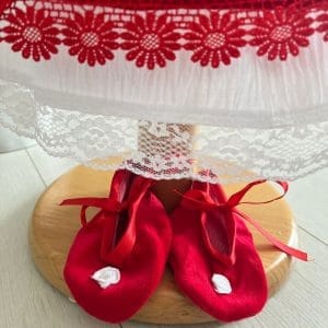 masura 3 – 6 luni (23 cm lungime, 60 cm circumferinta bustului , maneca 23 cm | fustita: 30 cm talie – elastic flexibil, 20 cm lungime | traistuta : 10 cm , lungime 29 cm | basmaluta: 31 cm latime , 42cm lungime )