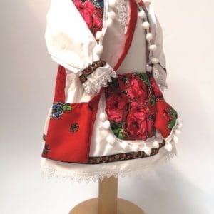 masura 9 – 12 luni (27 cm lungime, 64 cm circumferinta bustului , maneca 25 cm | fustita: 33 cm talie – elastic flexibil, 24 cm lungime | traistuta : 10 cm , lungime 29 cm | basmaluta: 31 cm latime , 42 cm lungime )