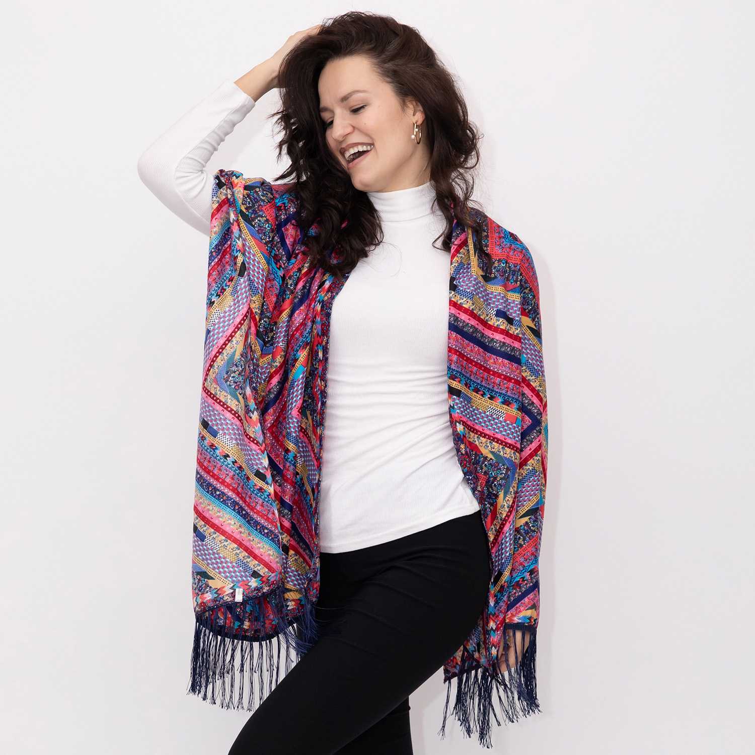 Este un șal versatil, cu o estetică clasică și rafinată, perfect atât pentru ocazii speciale, cât și pentru purtare zilnică.