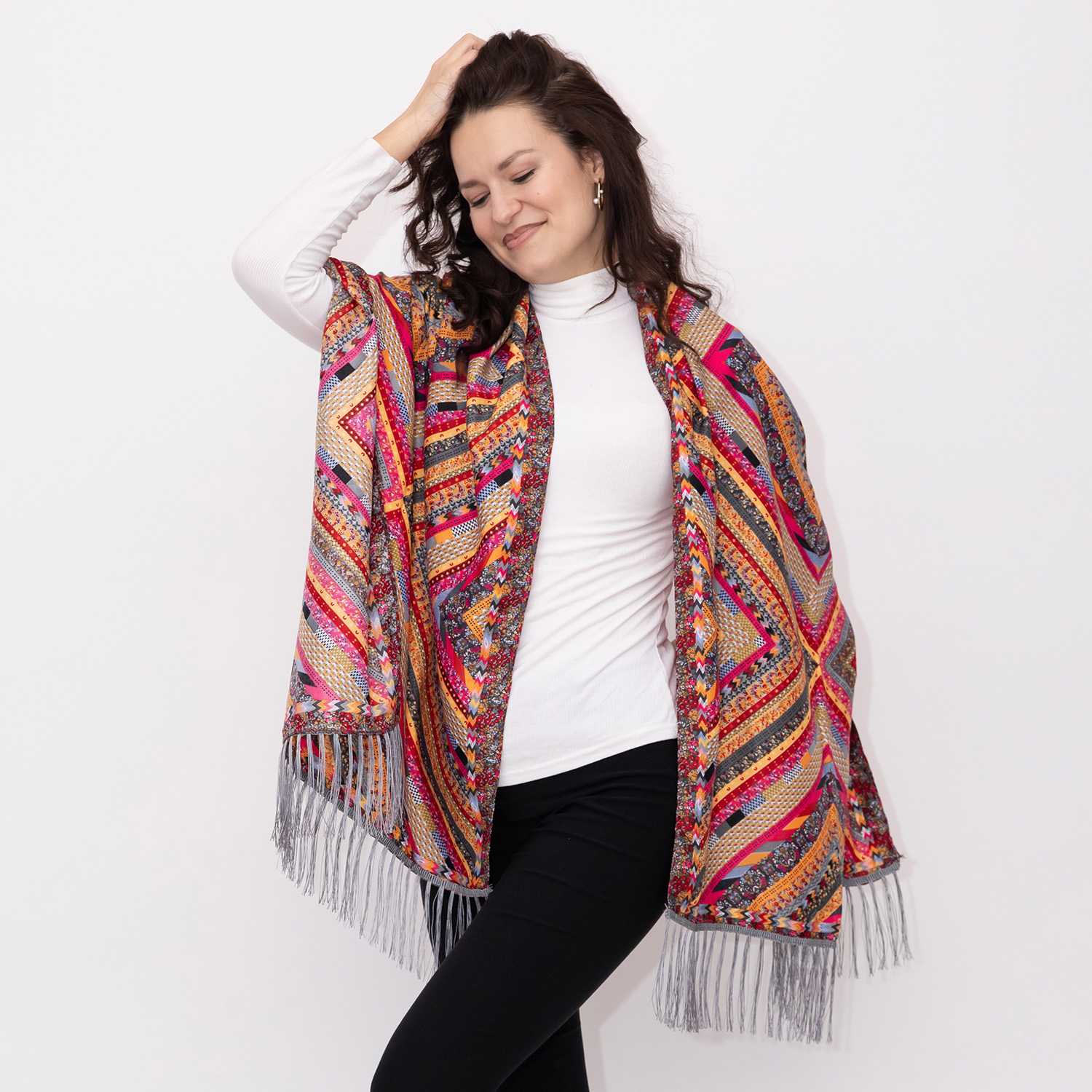 Este un șal versatil, cu o estetică clasică și rafinată, perfect atât pentru ocazii speciale, cât și pentru purtare zilnică.