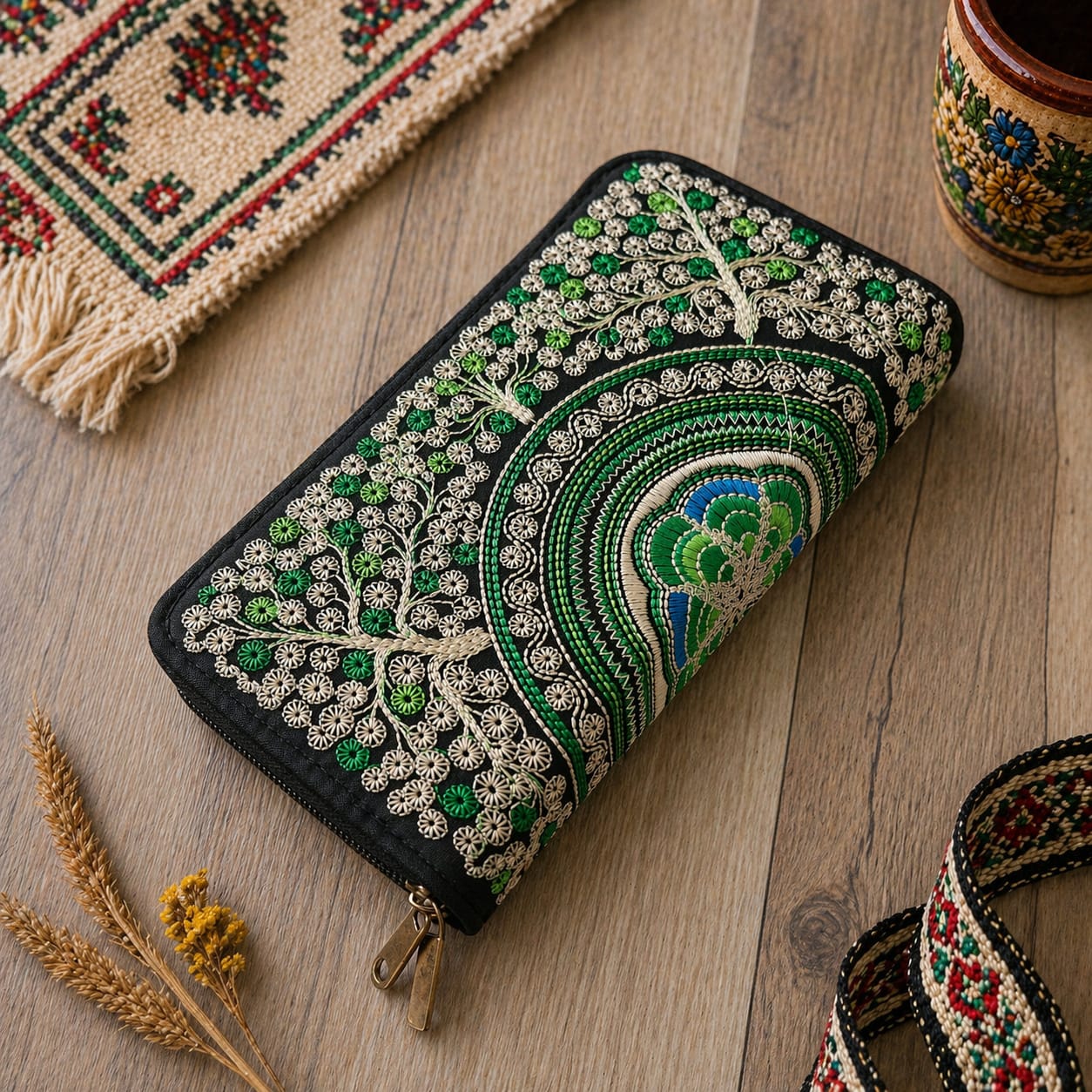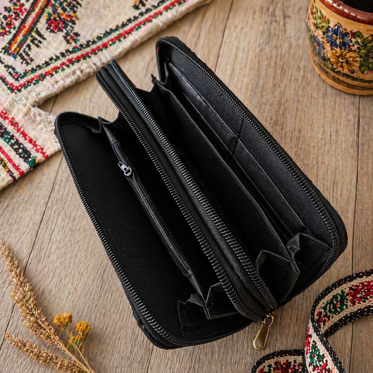Interiorul este captusit si compartimentat pentru depozitare de bani, card, permis conducere,