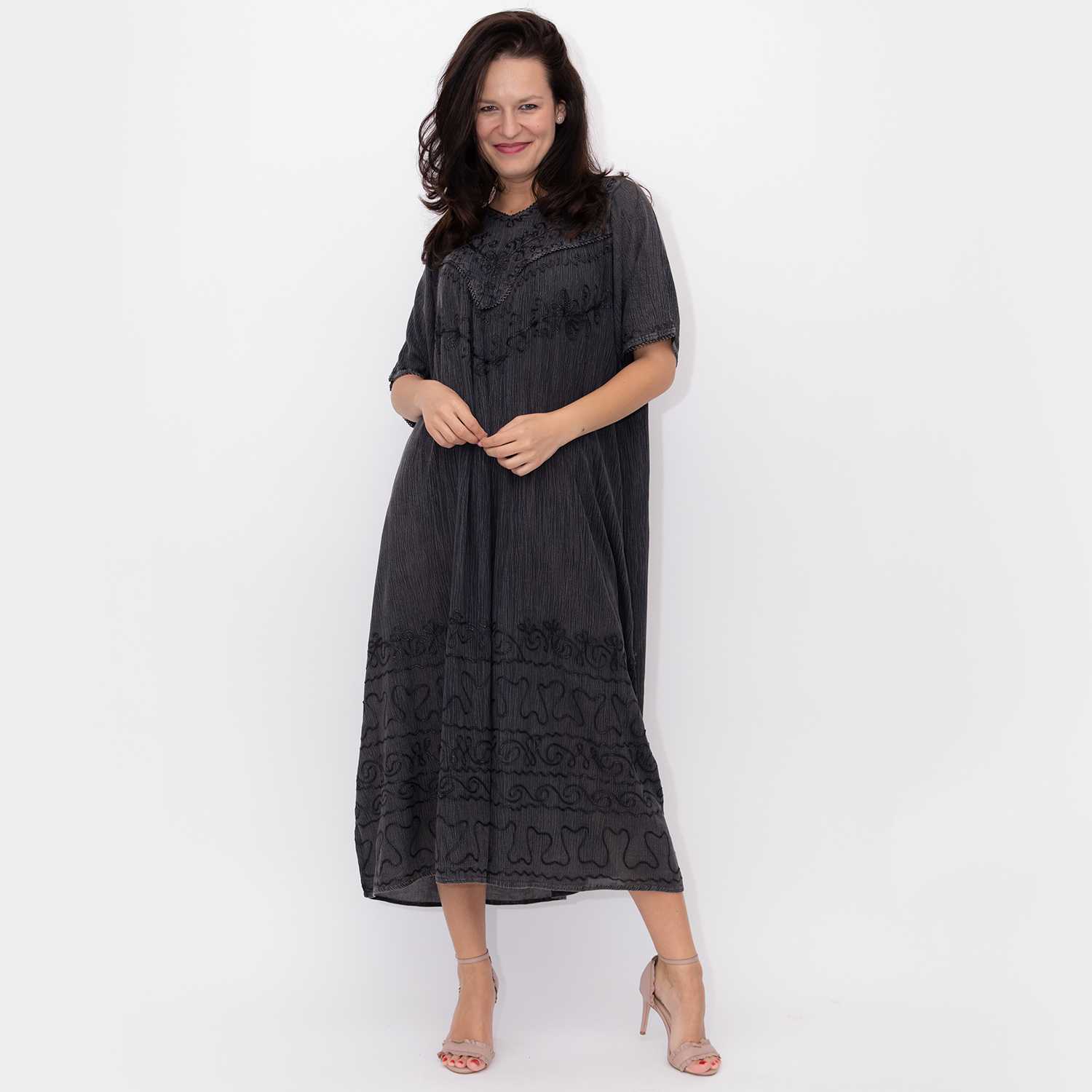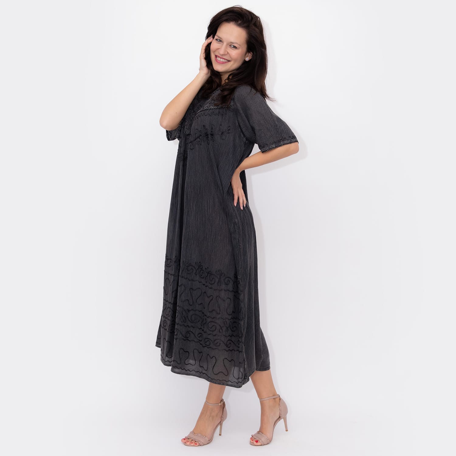 Material vascoza cu model imprimat.Este un material vaporos, usor de spalat si calcat, ideal pentru vremea calduraosa de vara. Croiul lejer ofera un confort pe toata durata purtarii rochiei.