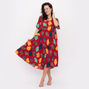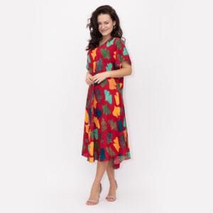 Croi: Rochia are un croi larg, evazat, care oferă libertate de mișcare și confort maxim. Are mâneci scurte și o lungime medie, până la genunchi sau puțin sub genunchi.