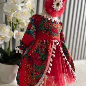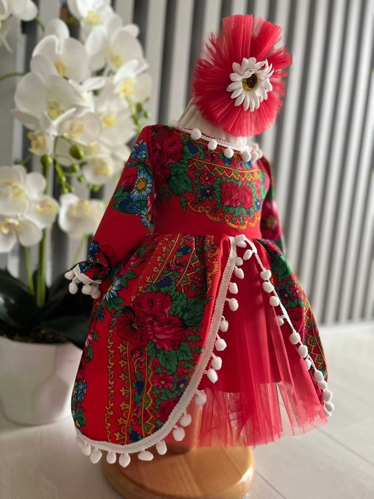 Rochița eleganta cu maneca scurta, confectionata dintr un material de bumbac cu model etno floral, iar la bază are un tulle delicat, vaporos si amplu. Rochita are un croi tip printesa. Este accesorizata cu broderie alba.