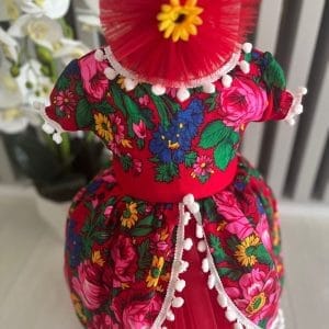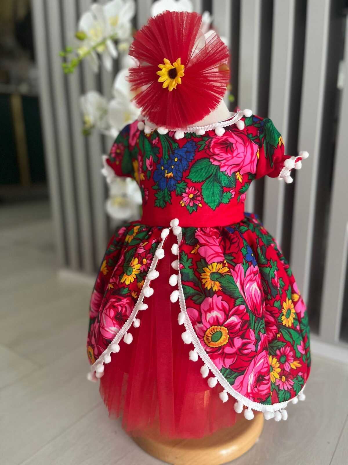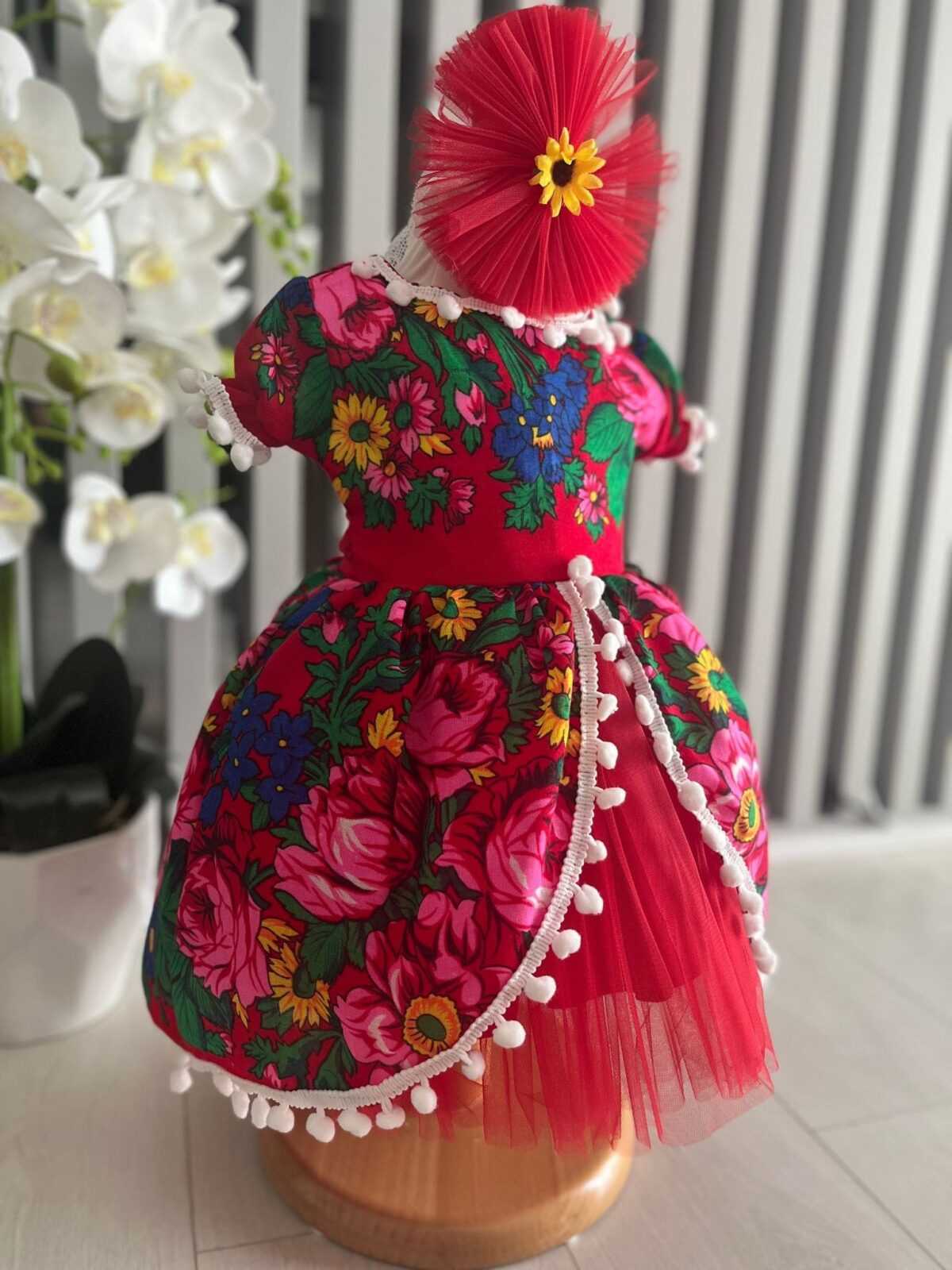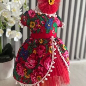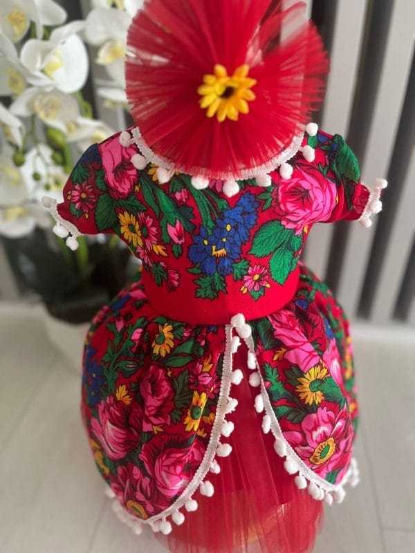 Rochița eleganta cu maneca scurta, confectionata dintr un material de bumbac cu model etno floral, iar la bază are un tulle delicat, vaporos si amplu. Rochita are un croi tip printesa. Este accesorizata cu broderie alba.