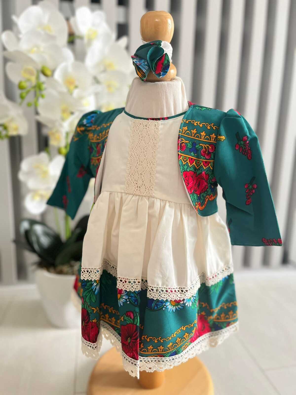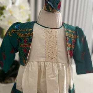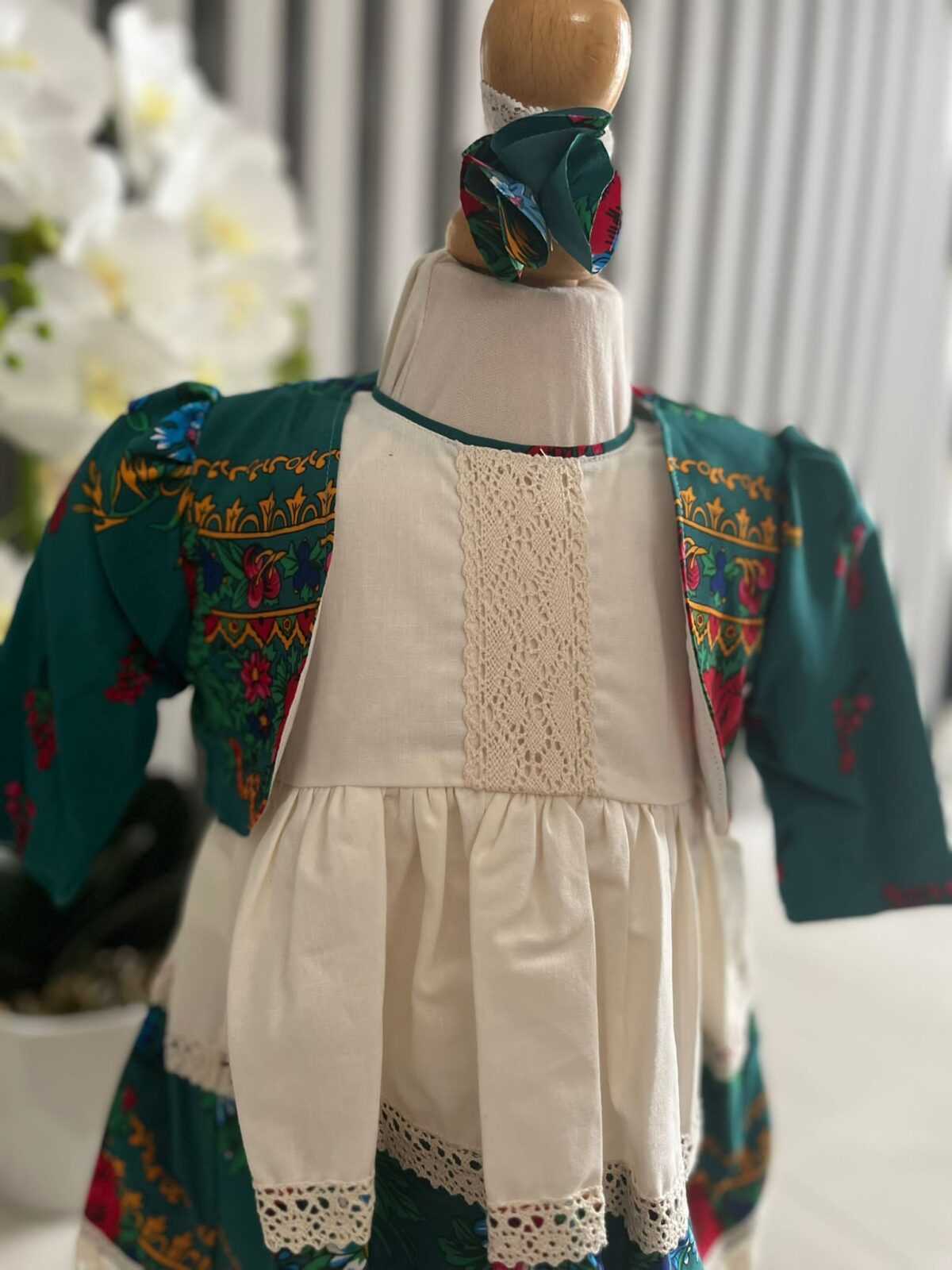 Setul este format din: rochita , bentita si bolero. Rochita este accesorizata cu broderie foarte frumoasa, care se imbina foarte bine cu modelul de pe rochita, dand o nota de eleganta si puritate.