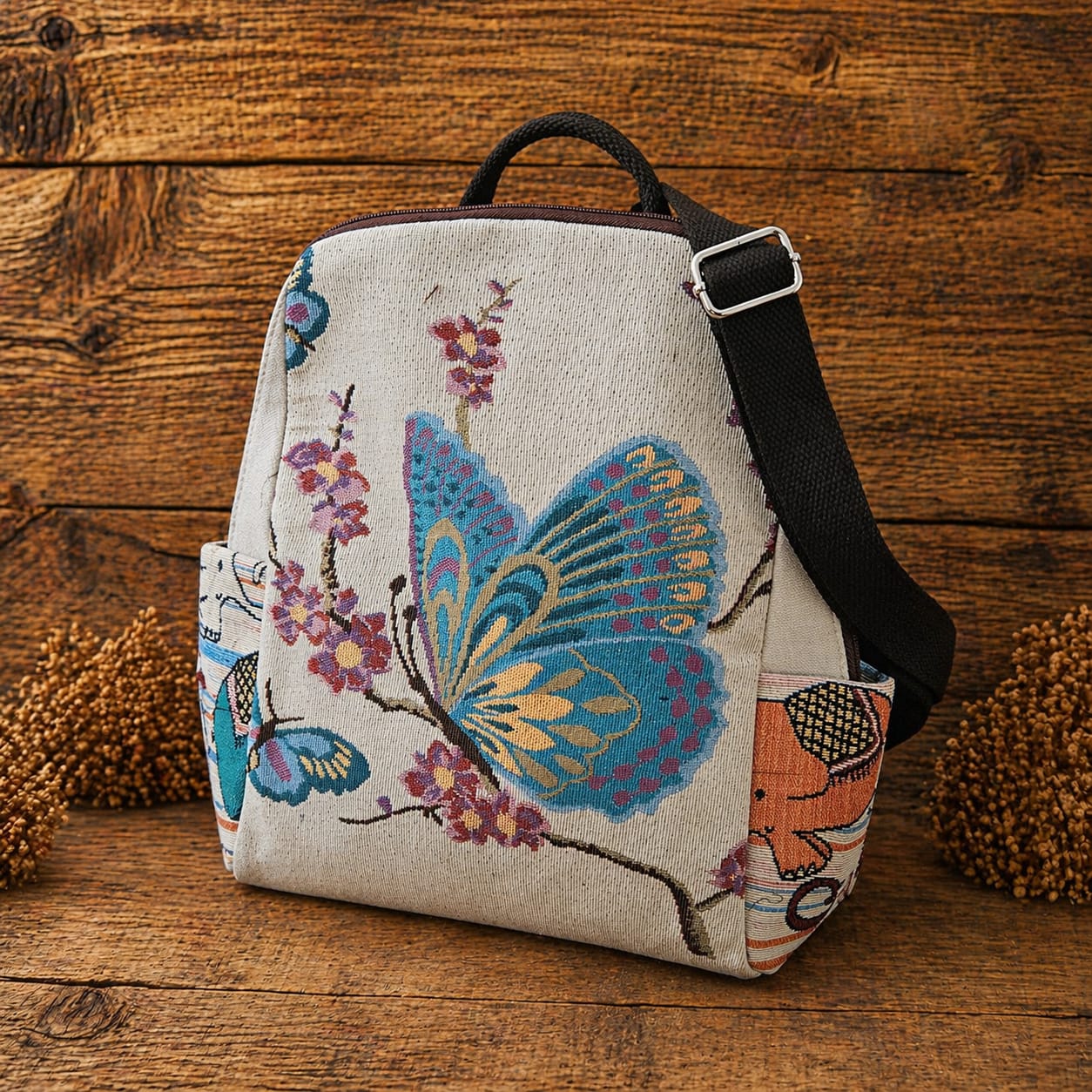 Realizat dintr-un material textil tip tapiserie (jacquard), rucsacul are o textură rezistentă și plăcută la atingere, care oferă durabilitate în timp și un aspect premium. Partea exterioară este decorată cu modele colorate, inspirate din natură (fluturi, animale, motive florale), ceea ce îl transformă într-o piesă statement.