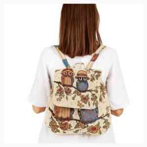 Este potrivit pentru ținute casual, boho-chic sau vintaAcesta este un rucsac elegant, confecționat dintr-un material textil gros, cu model țesut, având un design delicat inspirat din natură. Modelul prezintă fluturi mari, în nuanțe de albastru și auriu, alături de ramuri de copac înflorit, pe un fundal crem deschis.